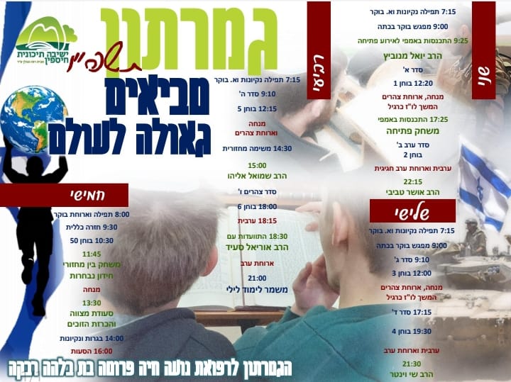 לו"ז הכנה לראש השנה בירושלים להורד הטופס לו"ז יום כיפור להורד הטופס תכנית החוגים תשפ"ו להורד הטופס הצגת שביעית - נדנדה להורד הטופס גמרתון - מרתון גמרא להורד הטופס